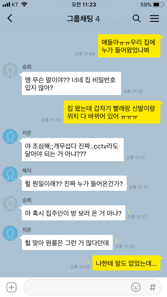 혹시나 누가 집에 침입해서 자신을 지켜보는 오싹한 생각까지 든 강씨는 두려움에 떨며 단톡방에서 친구들과 이야기를 나누기 시작했다.