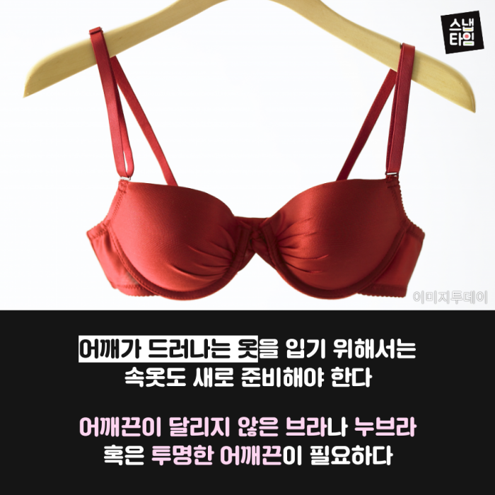 어깨가 드러나는 옷을 입기 위해서는 기존의 속옷과는 다른 속옷을 새로 준비해야 한다. 어깨끈이 달리지 않은 브라나 누브라 혹은 투명한 어깨끈이 필요하다.
