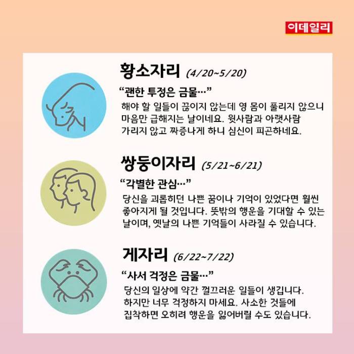 당신을 괴롭히던 나쁜 꿈이나 기억이 있었다면 훨씬 좋아지게 될 것입니다. 뜻밖의 행운을 기대할 수 있는 날이며, 이를 통해 옛날의 나쁜 기억들이 사라질 수 있습니다.