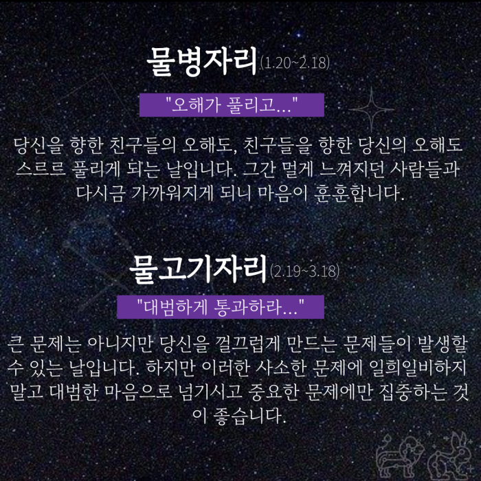 당신을 향한 친구들의 오해도, 친구들을 향한 당신의 오해도 스르르 풀리게 되는 날입니다. 그간 멀게 느껴지던 사람들과 다시금 가까워지게 되니 마음이 훈훈합니다.