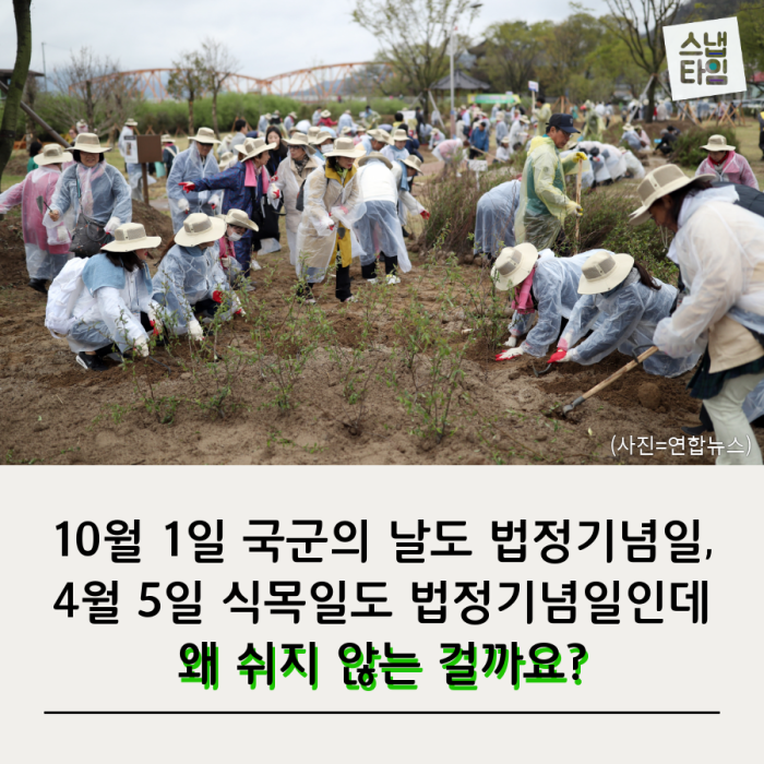 10월1일 국군의 날도 법정기념일, 4월5일 식목일도 법정기념일인데 왜 쉬지 않는 걸까요.