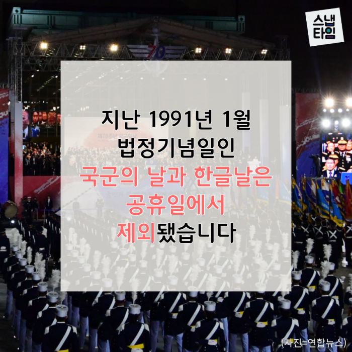 지난 1991년1월 법정기념일인 국군의 날과 한글날은 공휴일에서 제외됐습니다.
