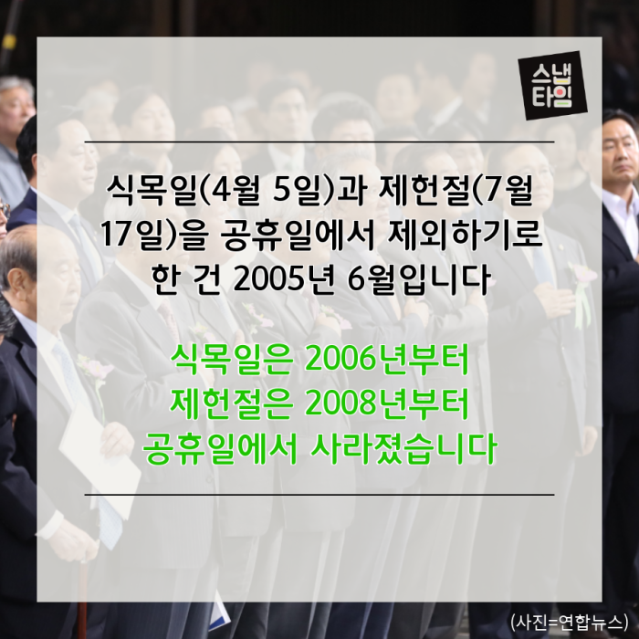 식목일(4월5일)과 제헌절(7월17일)을 공휴일에서 제외하기로 한 건 2005년6월입니다. 식목일은 2006년부터, 제헌절은 2008년부터 공휴일에서 사라졌습니다.