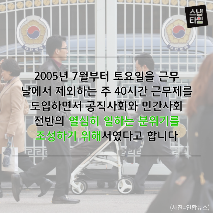 2005년7월부터 토요일을 근무 날에서 제외하는 주 40시간 근무제를 도입하면서 공직사회와 민간사회 전반의 열심히 일하는 분위기를 조성하기 위해서였다고 합니다.