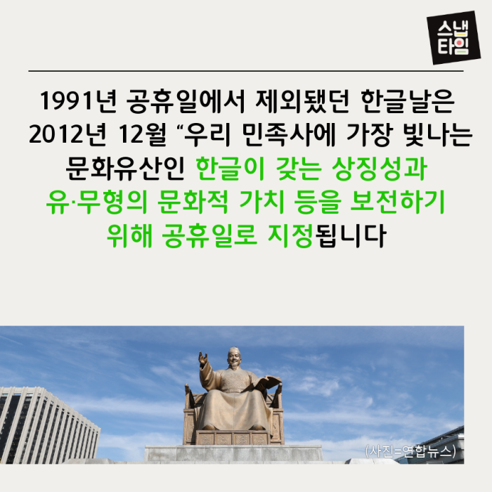 1991년 공휴일에서 제외됐던 한글날은 2012년12월 다시 우리 민족사에 가장 빛나는 문화유산인 한글이 갖는 상징성과 유·무형의 문화적 가치 등을 보전하기 위해 공휴일로 지정됩니다.