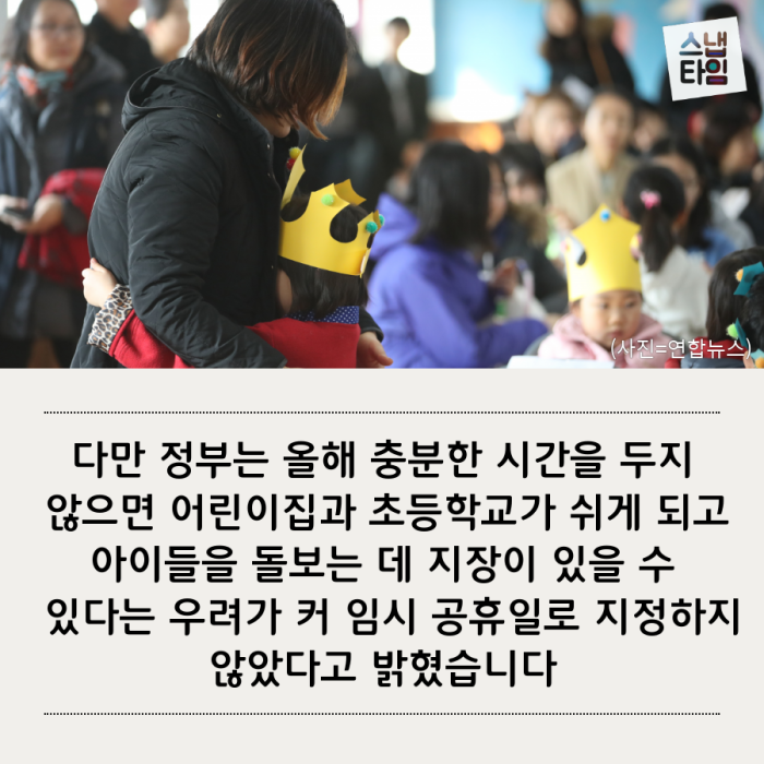 다만 정부는 올해 충분한 시간을 두지 않으면 어린이집과 초등학교가 쉬게 되고 아이들을 돌보는 데 지장이 있을 수 있다는 우려가 커 임시 공휴일로 지정하지 않았다고 밝혔습니다.