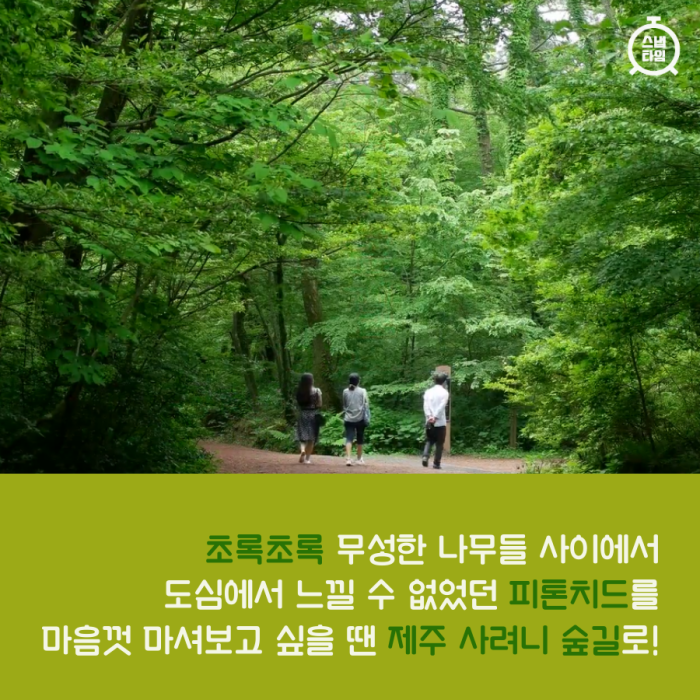초록초록 무성한 나무들 사이에서 도심에서 느낄 수 없었던 피톤치드를 마음껏 마셔보고 싶을 땐 제주 사려니 숲길로!