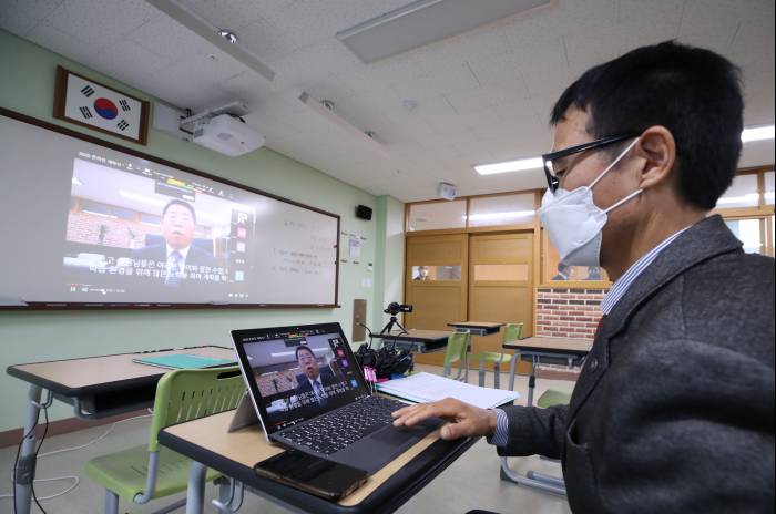 9일 오전 서울 성동구 도선고등학교 3학년 7반 교실에서 담임 교사가 온라인 플랫폼에 접속한 학생들과 학교장의 인사말을 들으며 개학식을 갖고 있다 (사진=연합뉴스)