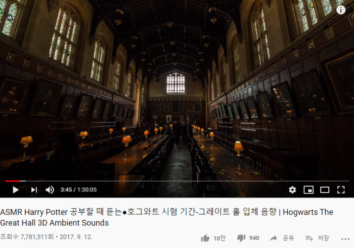 ASMR SOUPE 채널의 〈호그와트 시험기간, 그레이트 홀 입체음향〉은 대표적인 공부 ASMR 중 하나다. 타닥타닥 장작이 타는 소리와 책장을 넘기는 소리가 1시간 30분 동안 계속된다. 이따금씩 들리는 창 밖 천둥 소리는 내가 해리포터 세계관에 들어와 있다는 착각을 들게 할 정도다. 해당 영상은 조회수 778만회를 기록했다. (사진=유튜브 캡처)