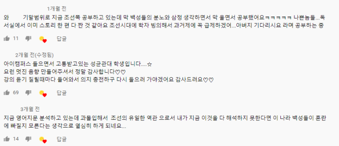YUZA ASMR채널의 'ASMR 성균관 유생들의 공부'의 댓글 중 일부 (사진=유튜브 캡처)
