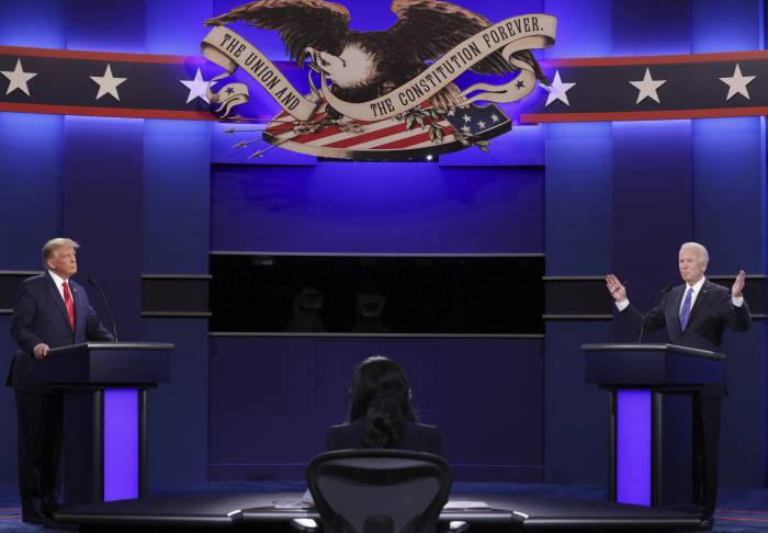 널드 트럼프(왼쪽) 미국 대통령이 미 테네시주 내슈빌의 벨몬트대에서 조 바이든 민주당 후보와 미 대선 최종 토론을 하고 있다. (사진=뉴시스)