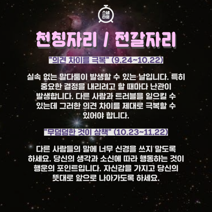 애정운에서는 과거의 사람에 의해 마음이 어수선해질 수 있는 날입니다. 커플인 분이라면 여기저기서 들려오는 소문에 좌우되지 마세요. 당신이 보고 들은 것만을 믿도록 하세요.