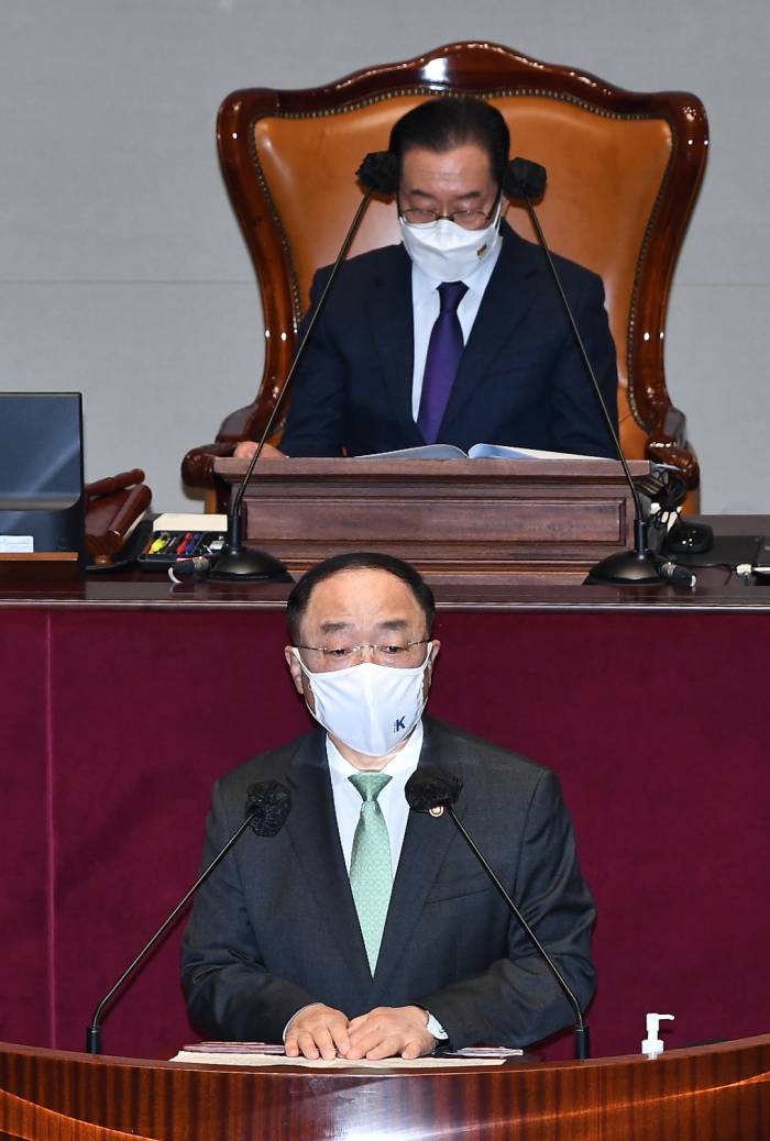 홍남기 경제부총리 겸 기획재정부 장관이 7일 서울 여의도 국회에서 열린 예산결산위원회 전체회의에서 추경 예산안 제안 설명을 하고 있다. (출처=뉴스1)